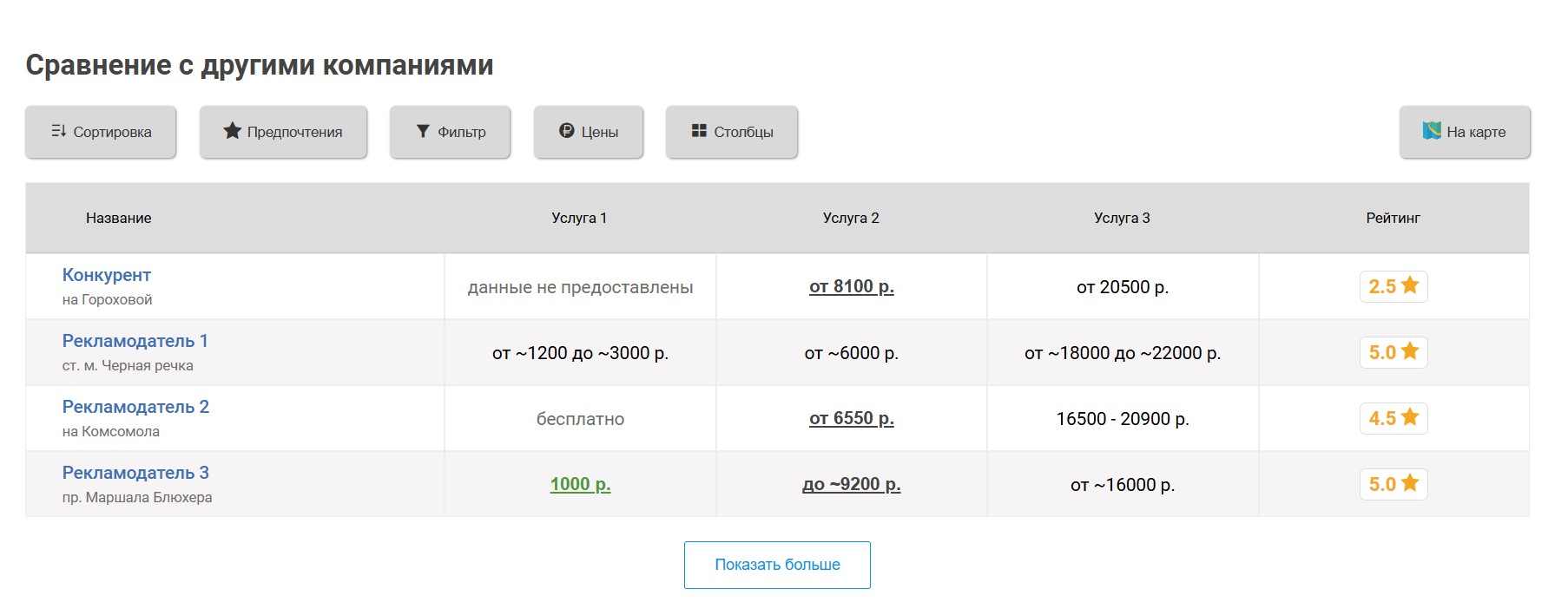 турагентств, продвигаемое турагентство попадёт к ним в таблицу «Сравнение по ценам», которая выглядит следующим образом: